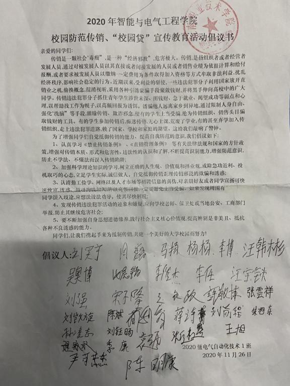 三、以各班为单位进行了签名活动,活动中,同学们郑重的签下了自己的名字,并表示要坚决抵制传销,远离传销,坚决不参加任何传销活动。
