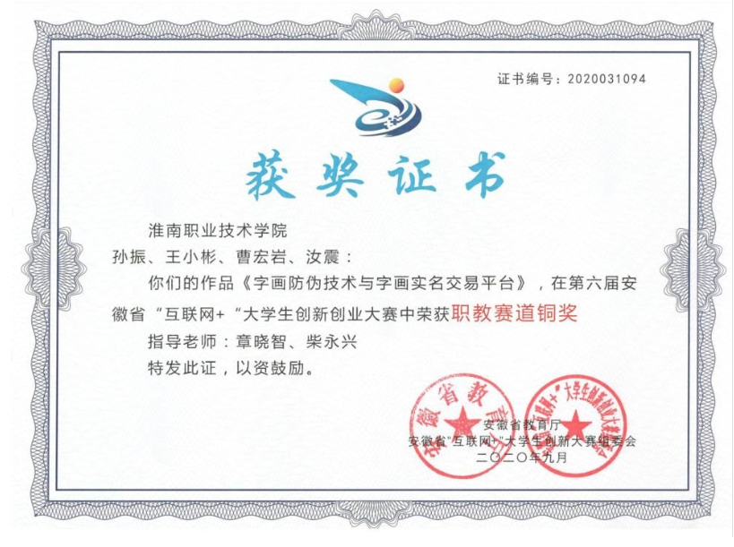 智能与电气工程bwin官网在“建行杯”第六届中国国际“互联网+”大员工创新创业大赛选拔赛暨安徽省“互联网+”大员工创新创业大赛中喜获佳绩。bwin官网章晓智老师和人事处柴永兴老师联合指导项目《字画防伪技术与字画实名交易平台》获得安徽省职教赛道铜奖。