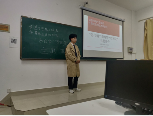 10月15日-11月11日期间,信息与电气工程系开展以 “ 防传销、“套贷”“校园贷””为主题的校园防范传销主题班会活动。10月22日晚自习,18计算机应用技术双创班在4103教室举办防范传销、“套路贷”“校园贷”宣传教育主题班会,根据国家关于防范和打击传销、“套路贷”“校园贷”的法律法规为同学们开展专题教育宣传,切实增强员工的防范意识和能力。由18双创班班长陈坤同学主持。