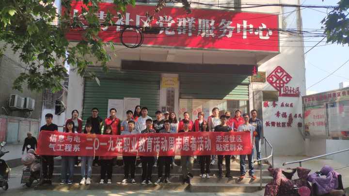迎祖国七十华诞,展职教时代风采。为落实全国教育大会精神和《国家职业教育改革实施方案》新要求,营造庆祝中华人民共和国成立70周年的良好氛围,办好2019年职业教育活动周,信息与电气工程系于5月9日,开展了“走进社区、贴近群众”——志愿者活动。