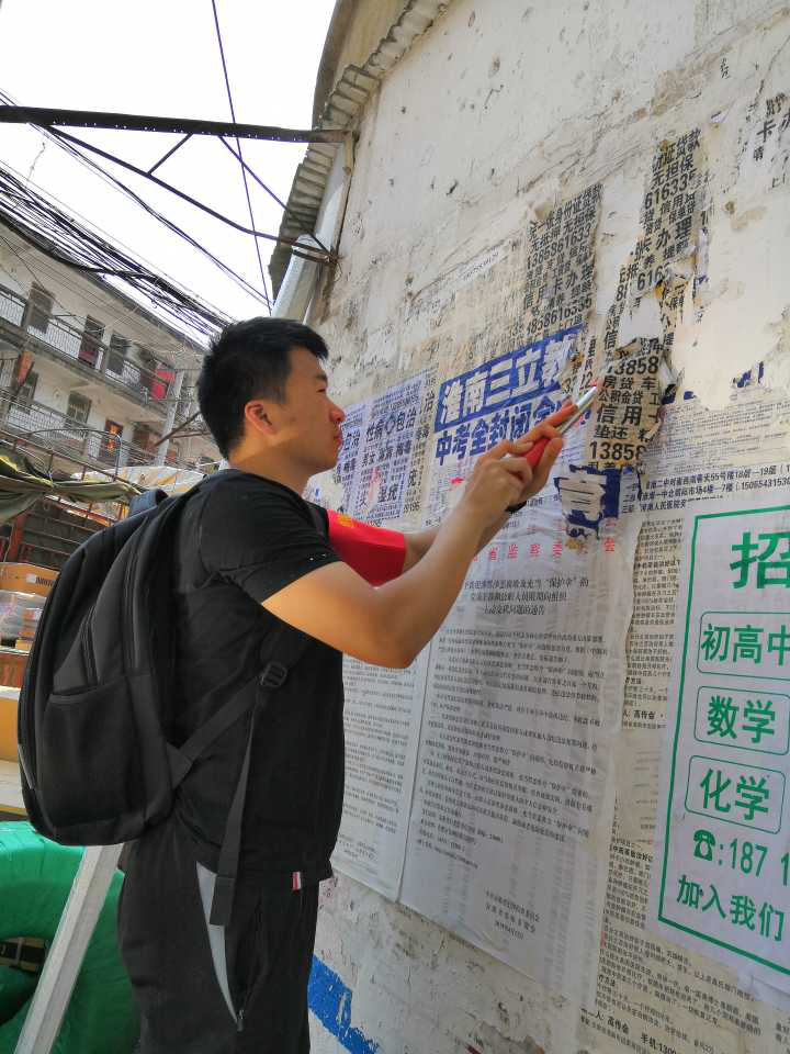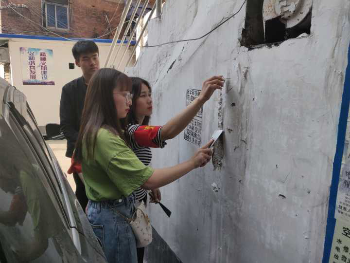 志愿者们一行16人早上七点整在系部办公楼前集合,乘坐110路公交车前往此次志愿服务地点长青社区。到达目的地后,便开始在社区工作人员的安排下开始了热火朝天的工作,此次活动的主要内容有:清扫地面垃圾、清除社区单元楼的小广告、拔除由居民种植和自由生长的杂草等,活动一直持续到中午十一点。