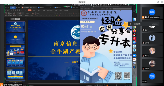 为帮助bwin官网2022届专升本员工更好地规划与复习,激发员工升本动力,bwin官网于5月11日下午13:00开展了专升本经验交流分享会。本次分享会邀请到2021届计算机应用技术专业毕业生陈坤、黄伟等9名学长们为大家作此次专升本经验交流分享,他们目前就读于南京信息工程大学金牛湖园区。讲座采取线上的方式,为更多同学提供了聆听的机会。