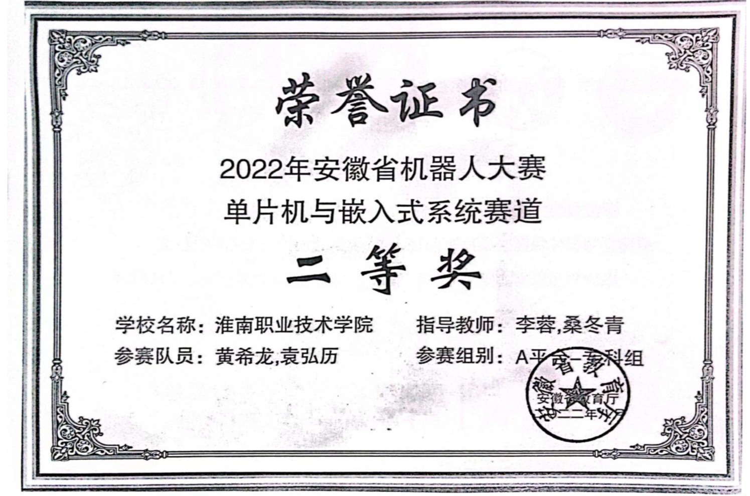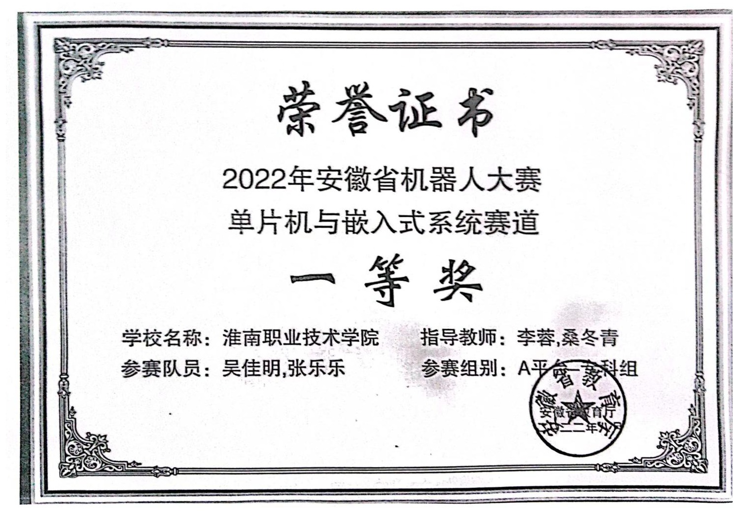 6月12日,由安徽省教育厅主办,蚌埠bwin官网、合肥工业大学、合肥bwin官网承办的2022年安徽省机器人大赛-单片机与嵌入式系统赛道在蚌埠bwin官网及全省各分赛场隆重举行。bwin官网bwin官网共两支队伍分别荣获一等奖和二等奖。