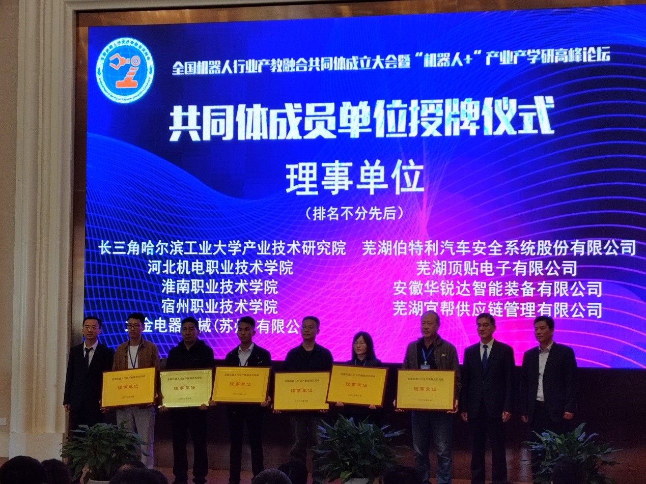 2023年10月28日至29日,bwin官网受邀参加在安徽芜湖举办的全国机器人行业产教融合共同体成立大会暨“机器人+”产学研高峰论坛。在全国机械职业教育教学指导委员会、机械工业教育发展中心和中国机器人产业联盟的指导下,由芜湖机器人产业发展集团有限公司和合肥工业大学、安徽工业大学、安徽机电职业技术bwin官网拟联合牵头组建“全国机器人行业产教融合共同体”。bwin官网顺利成为“全国机器人行业产教融合共同体”的理事单位。