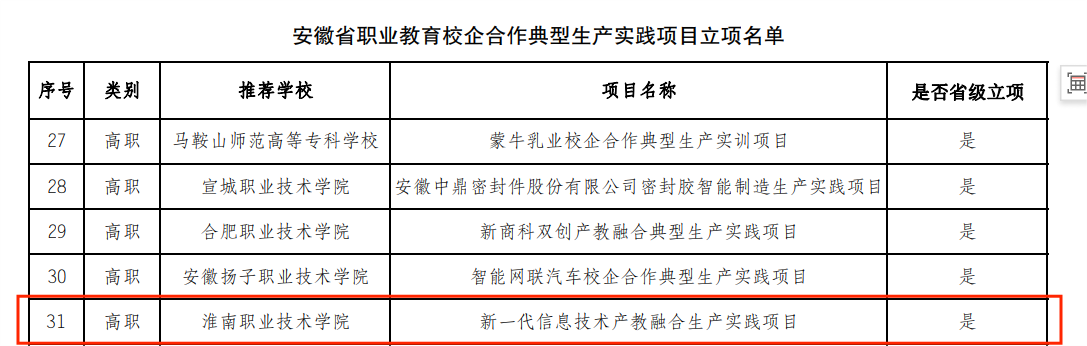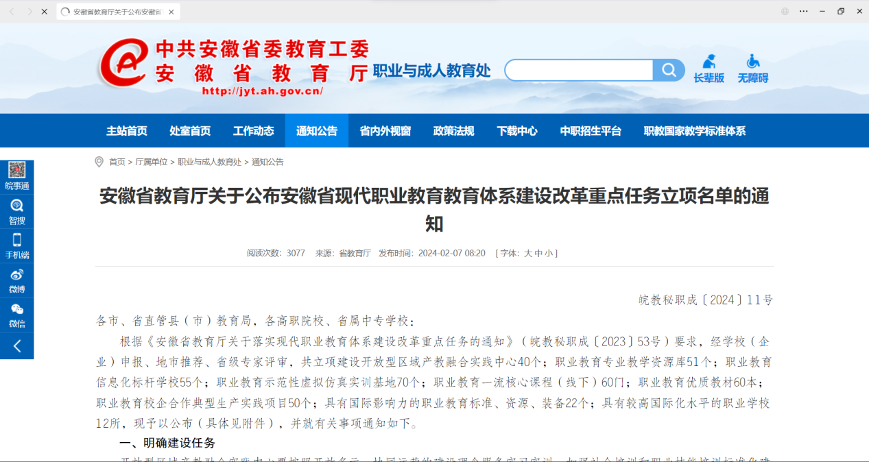 近日安徽省教育厅发表了安徽省教育厅“关于公布安徽省现代职业教育教育体系建设改革重点任务立项名单的通知”bwin官网bwin官网“新一代信息技术产教融合生产实践项目”获得立项。