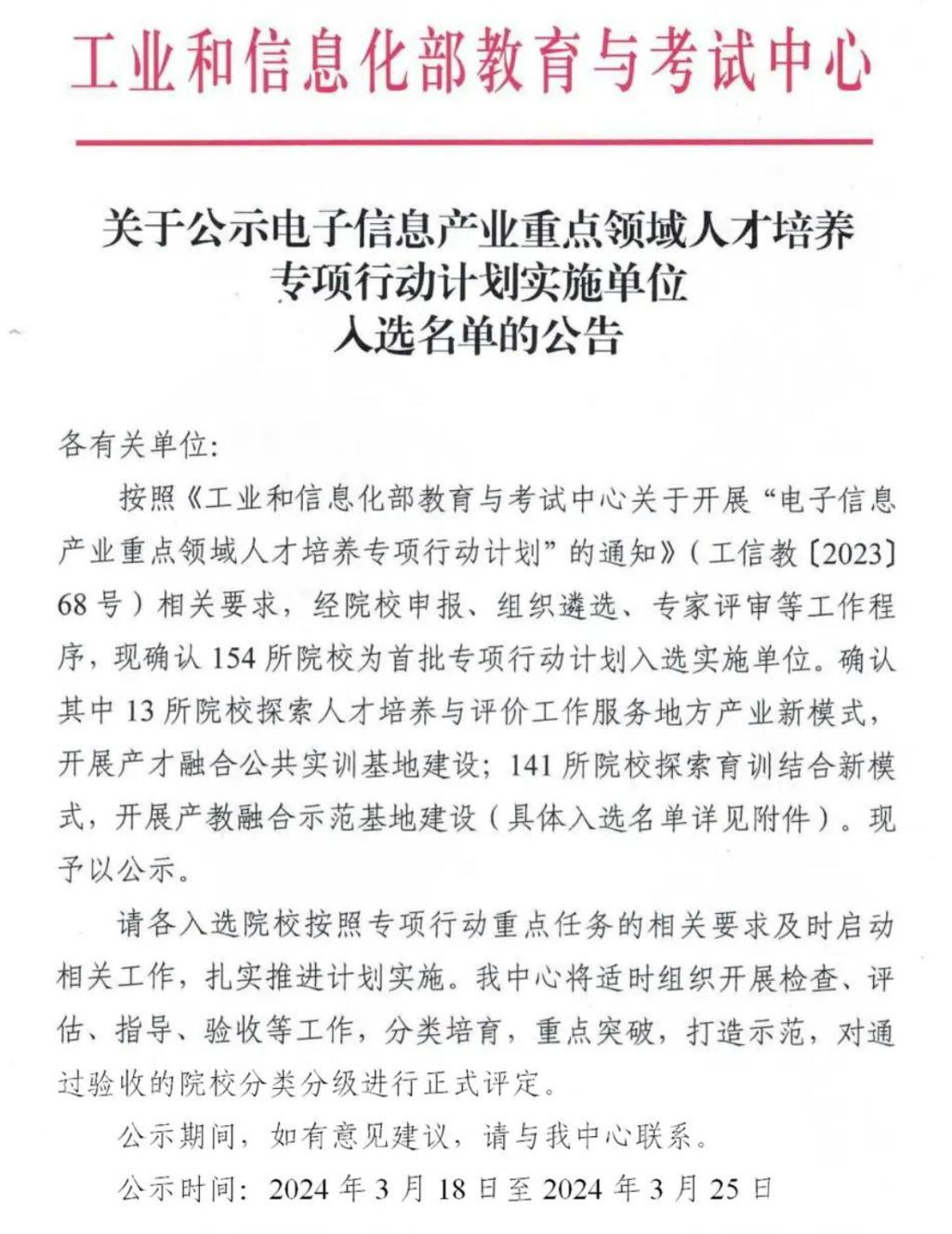 近日,《关于公示电子信息产业重点领域人才培养专项行动计划实施单位入选名单的公告》公布,bwin官网新一代信息技术产业bwin官网成功入选名单!