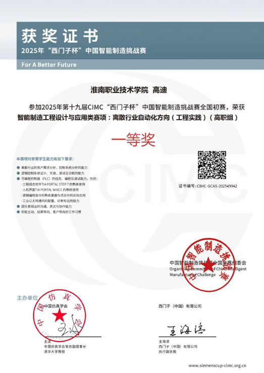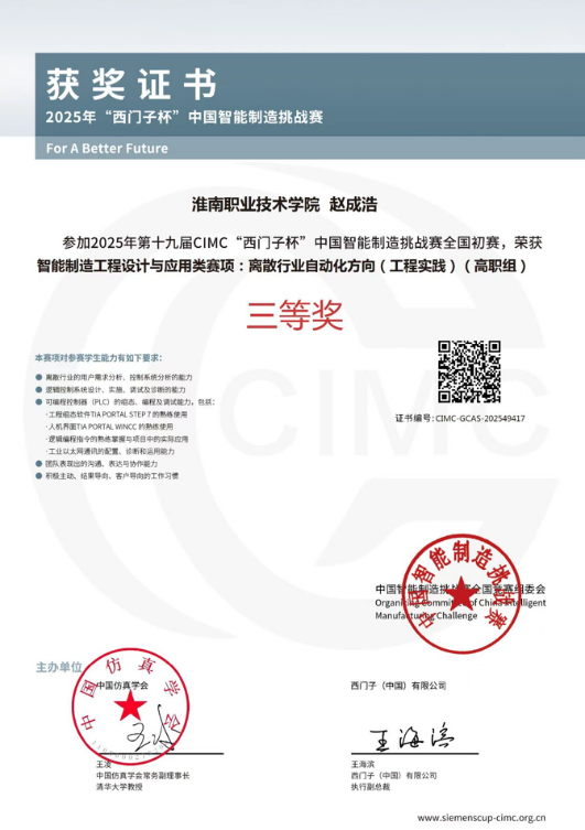 近日,2025年第十八届西门子杯中国智能制造挑战赛公布成绩,bwin官网bwin官网刘杨斌、储光老师指导的三支队伍凭借扎实的技术水平和创新能力,荣获工程实践赛道省赛一等奖1项、三等奖1项。