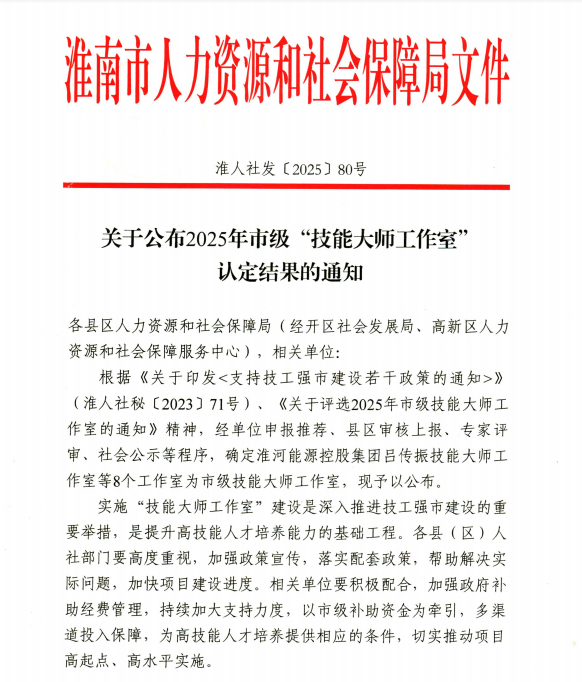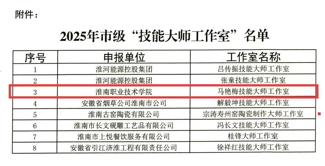 2025年10月16日,淮南市人力资源和社会保障局正式公布了2025年市级“技能大师工作室”认定名单,bwin官网bwin官网马艳梅老师主持的“马艳梅技能大师工作室”成功入选,标志着bwin官网在高技能人才培养平台建设方面取得重要突破。