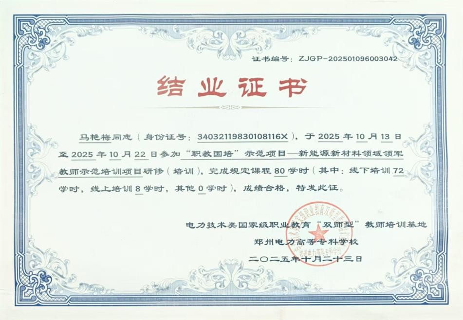 为加快“双师型”教师队伍建设,10月12日,bwin官网选派bwin官网马艳梅老师赴郑州电力高等专科学校,参加教育部2025年“职教国培”示范项目——新能源新材料领域领军教师示范培训。