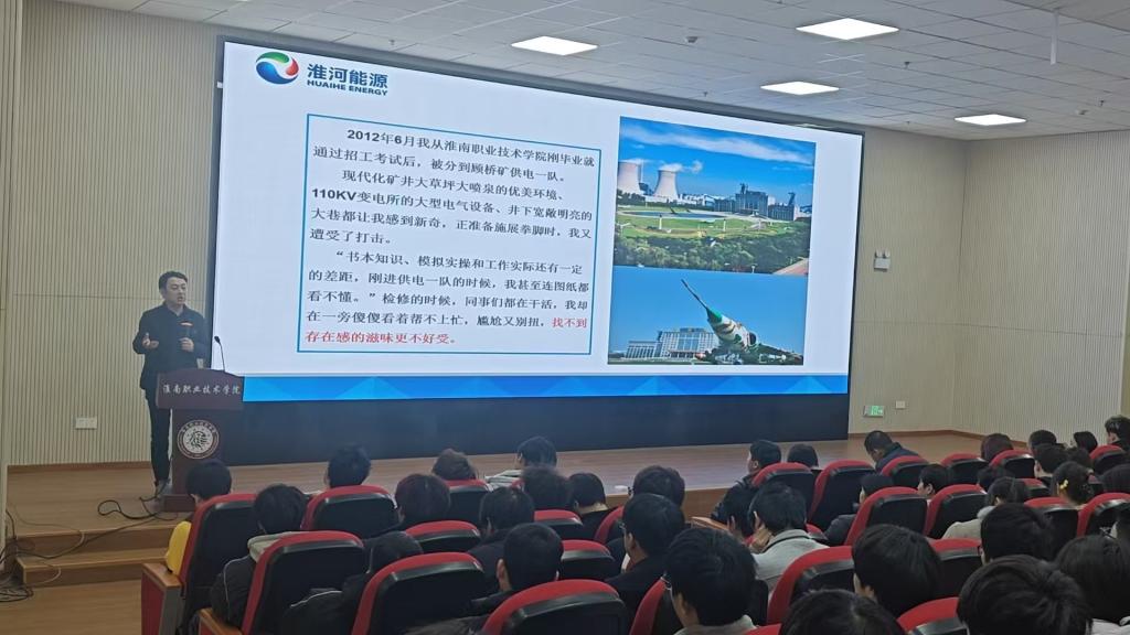 讲座现场,程晨结合自身从基层电工,成长为矿井供电系统技术专家的经历,分享了 “看、听、查、修、验” 维修五步法的实操技巧,以及带领团队排查100余起安全隐患、研发多项国家专利的创新故事。“当年在母校打下的电气理论基础,是我破解现场难题的‘金钥匙’。”他以 “高防开关双电源自动切换设计”为例,拆解了“把课堂知识转化为矿井安全生产力” 的实践路径,引发员工阵阵惊叹。